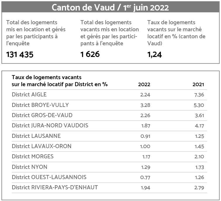 In detail and by way of example, the vacancy rate on the rental market in the Lausanne district is 0.91%, in the Aigle district 2.24%, in the Jura Nord-Vaudois district 1.87%, and in the Riviera-Pays-Enhaut district 1.94%. Even if these rates do not take into account vacant units put up for sale, the latter can hardly explain the differences with the figures used by Statistique Vaud, which show a vacancy rate of 0.56% for the Lausanne district, 1.62% for the Aigle district, 1.4% for the Jura Nord-Vaudois district and 1.17% for the Riviera-Pays-Enhaut district.